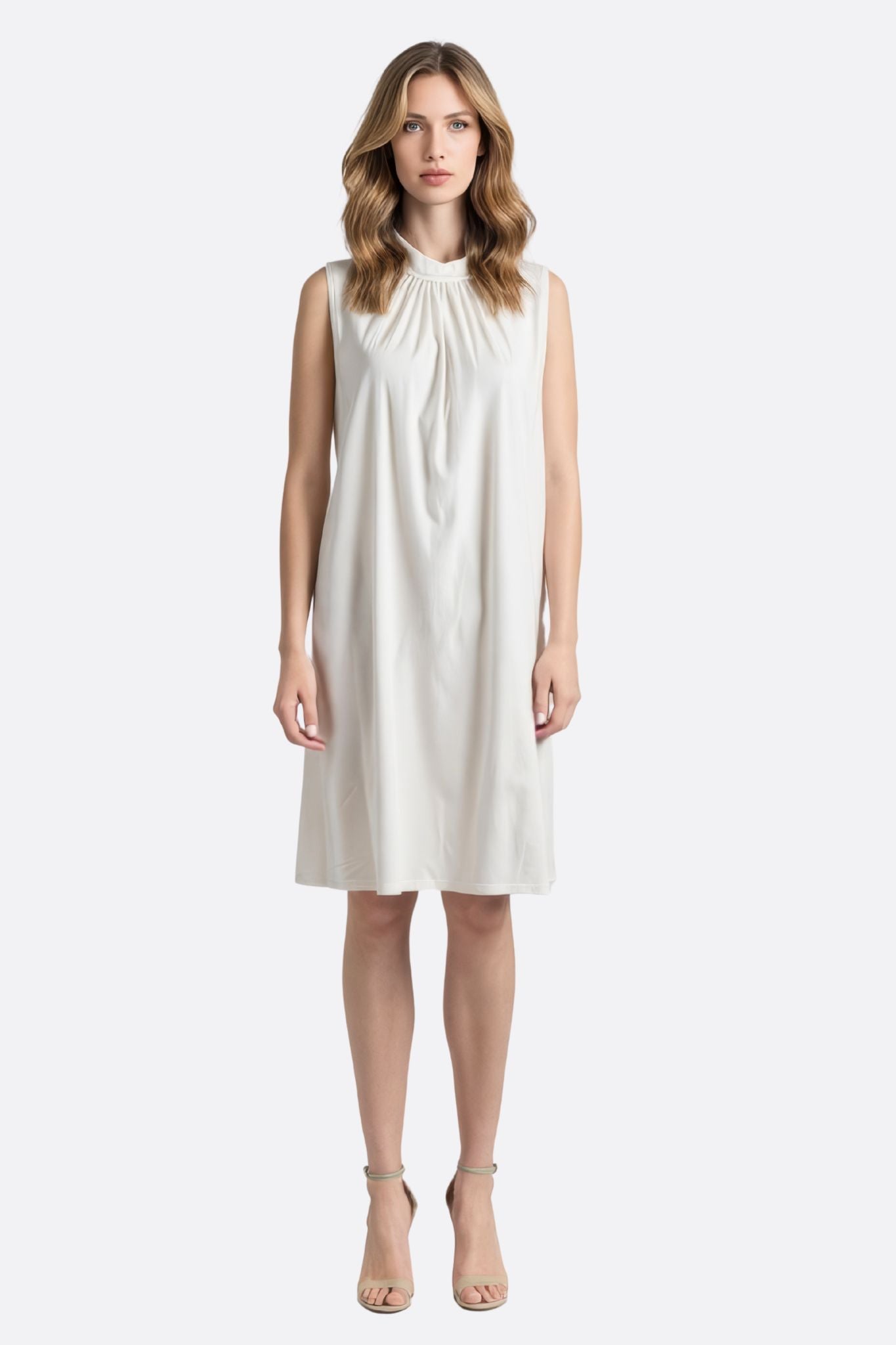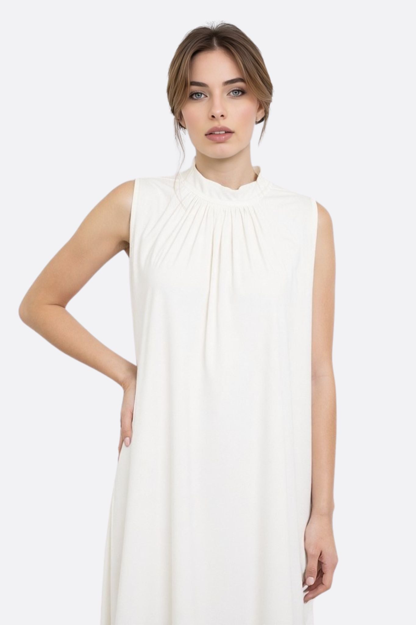 This White Draped Neck Midi Dress blends lightness, refinement, and timeless style. With its flowing cut and sleeveless silhouette, it flatters all body types while offering an airy, sophisticated feel. Perfect for summer days, elegant evenings, or chic city looks.